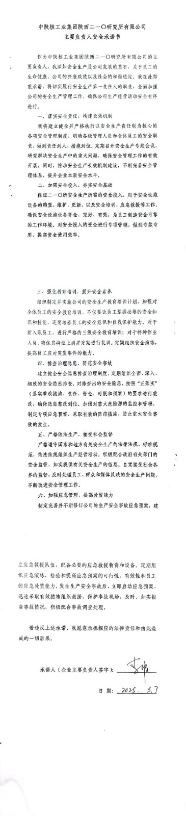 中陜核工業(yè)集團(tuán)陜西二一〇研究有限公司主要負(fù)責(zé)人安全承諾書