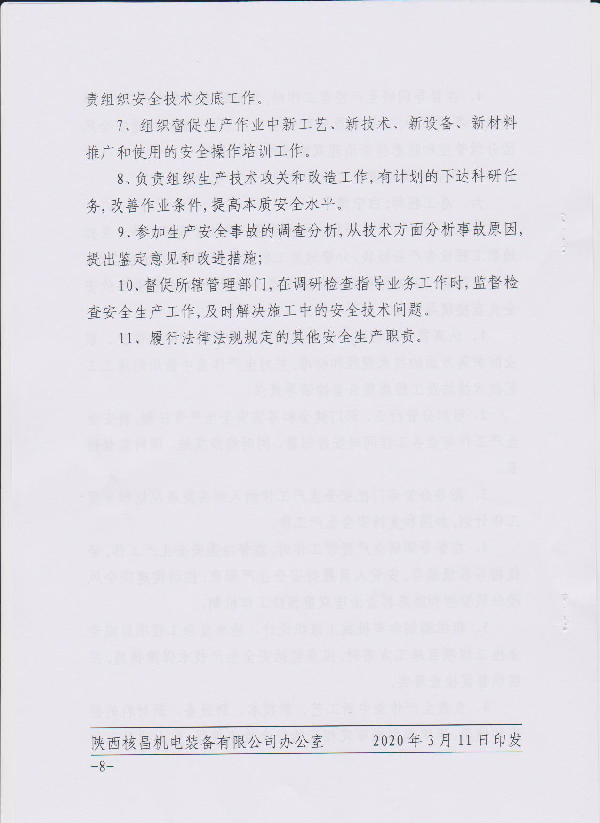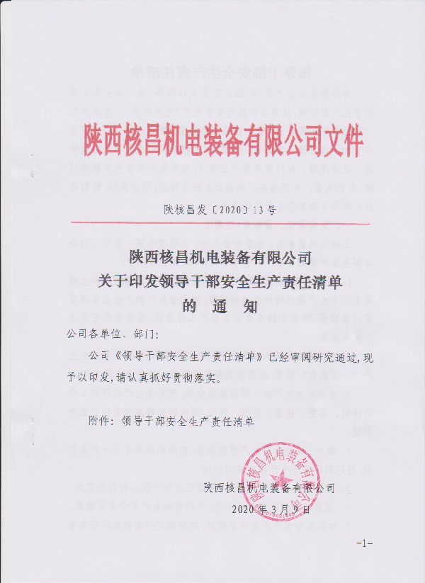 陜西核昌機電裝備有限公司關于印發領導干部安全生產責任清單的通知